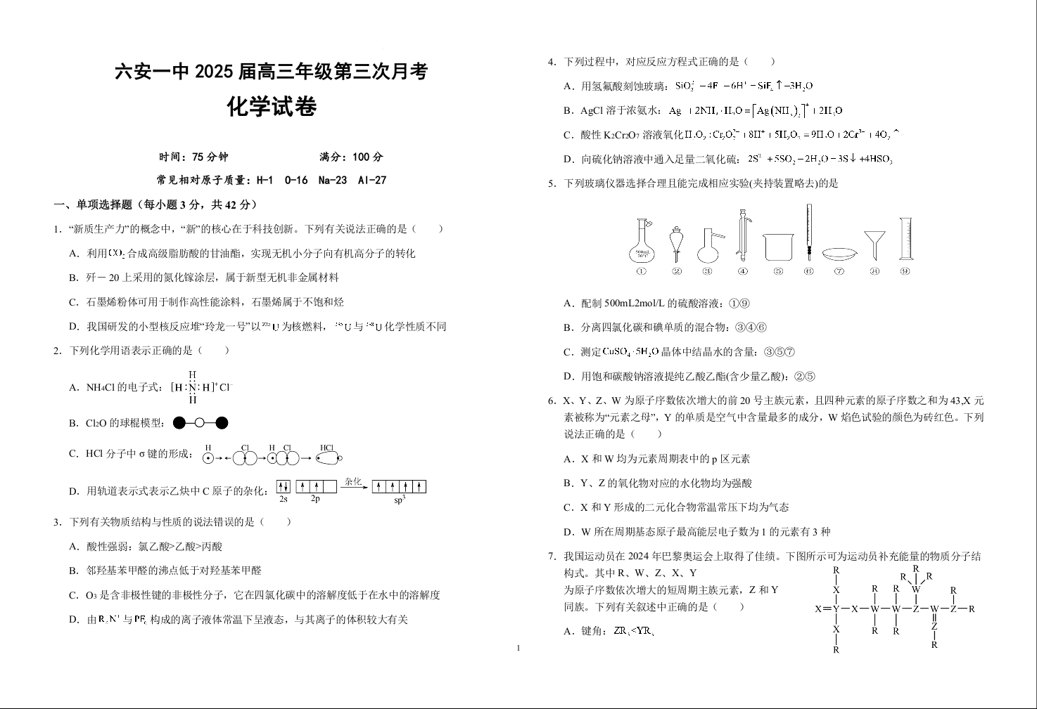 安徽省六安第一中学2025届高三上学期第三次月考(11月)化学+答案