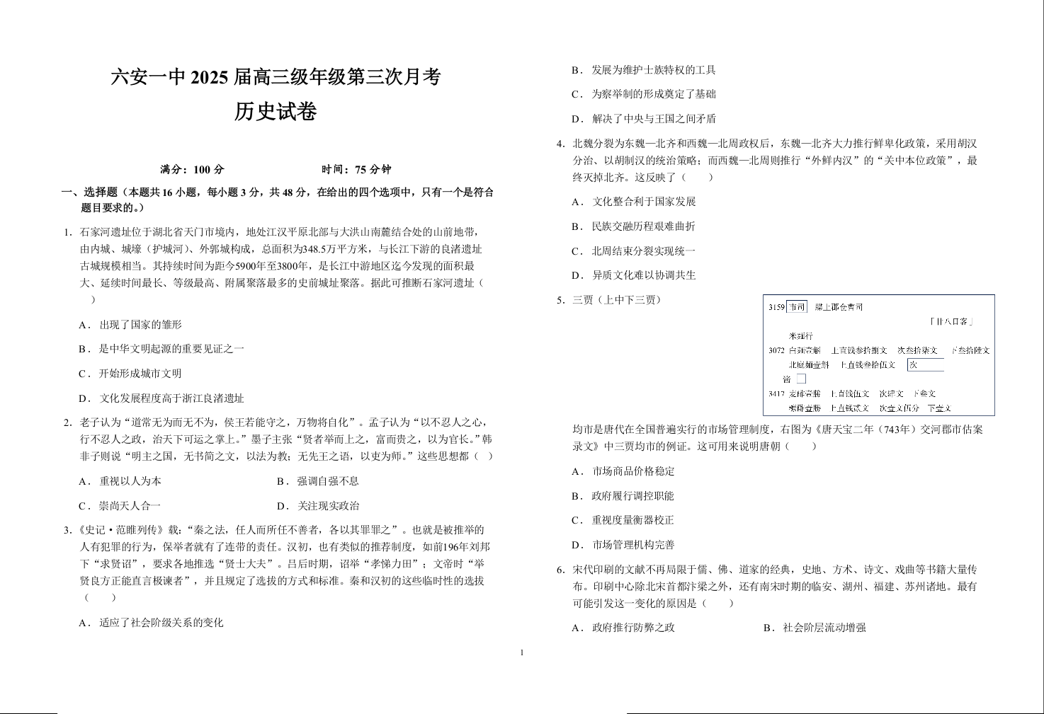 安徽省六安第一中学2025届高三上学期第三次月考(11月)历史+答案