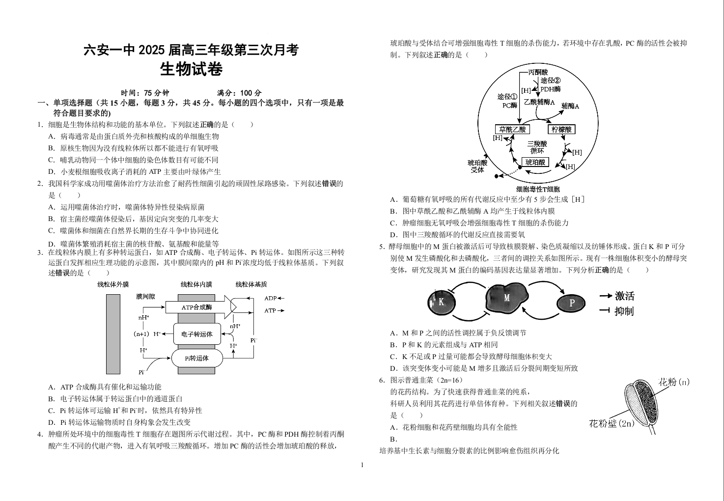 安徽省六安第一中学2025届高三上学期第三次月考(11月)生物+答案