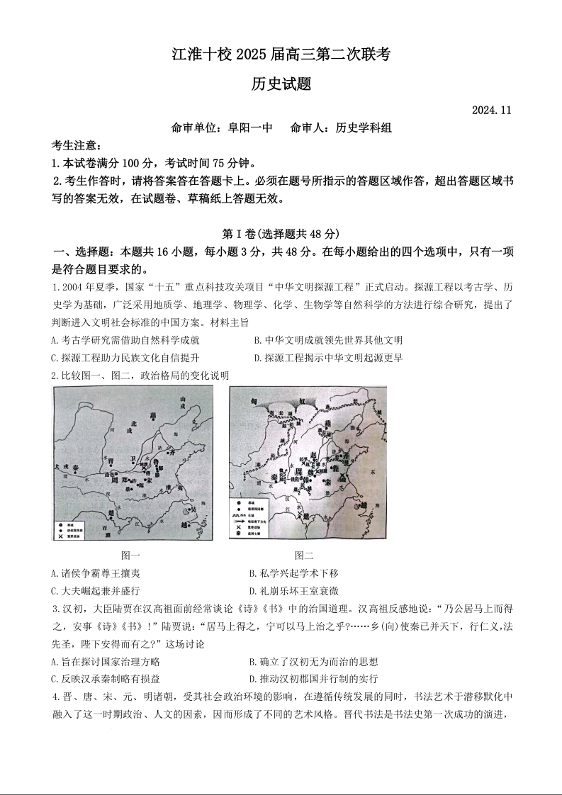 安徽省江淮十校2025届高三上学期第二次联考历史+答案
