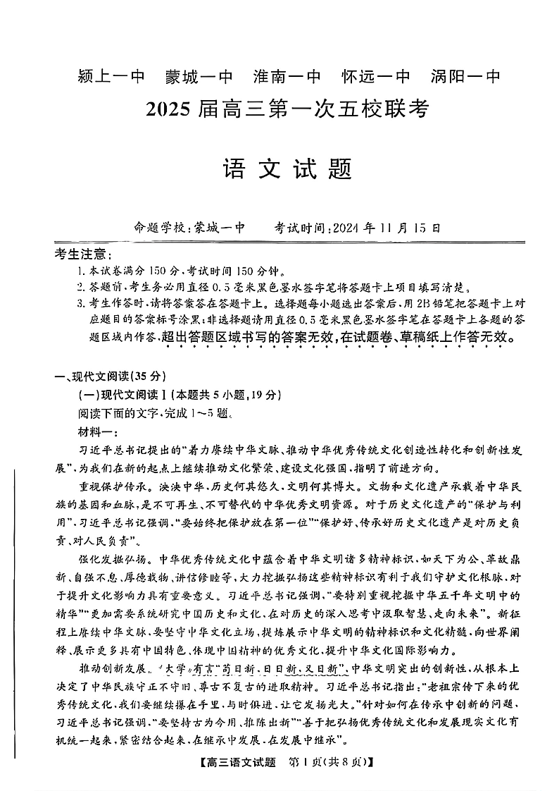 安徽省2025届高三上学期第一次五校联考语文+答案