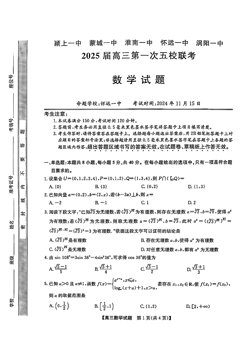 安徽省2025届高三第一次五校联考数学