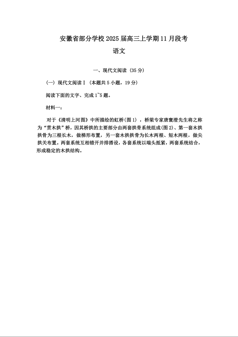 安徽省1号卷A10联盟2025届高三上学期11月段考语文+答案