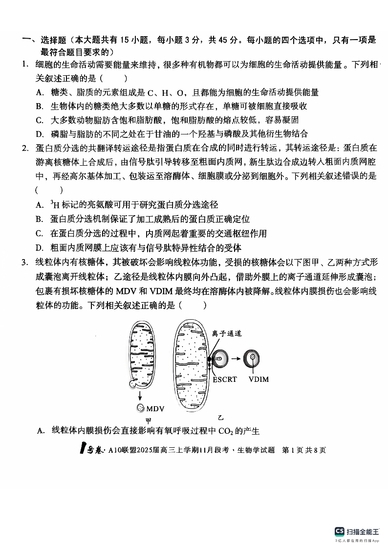 安徽省1号卷A10联盟2025届高三上学期11月段考生物