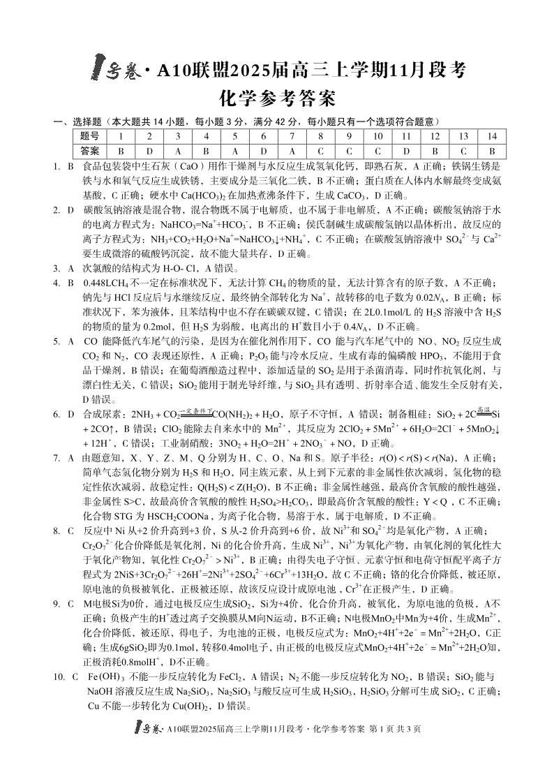 安徽省1号卷A10联盟2025届高三上学期11月段考化学答案