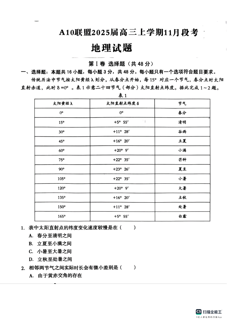 安徽省1号卷A10联盟2025届高三上学期11月段考地理