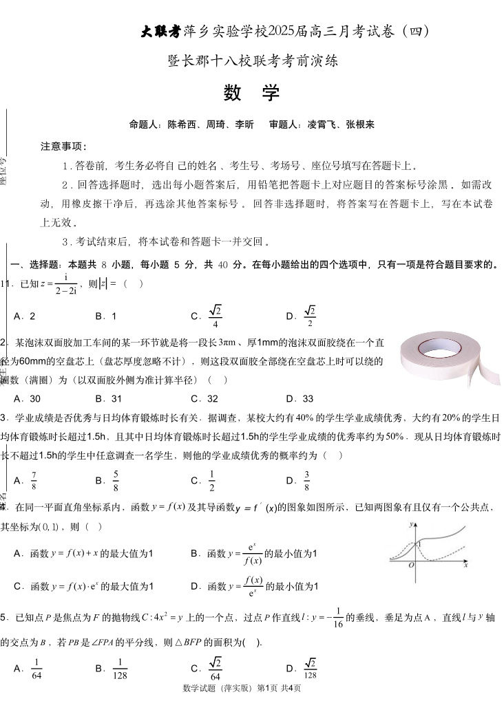 江西省萍乡实验学校2025届高三月考试卷(四)暨长郡十八校联考考前演练数学