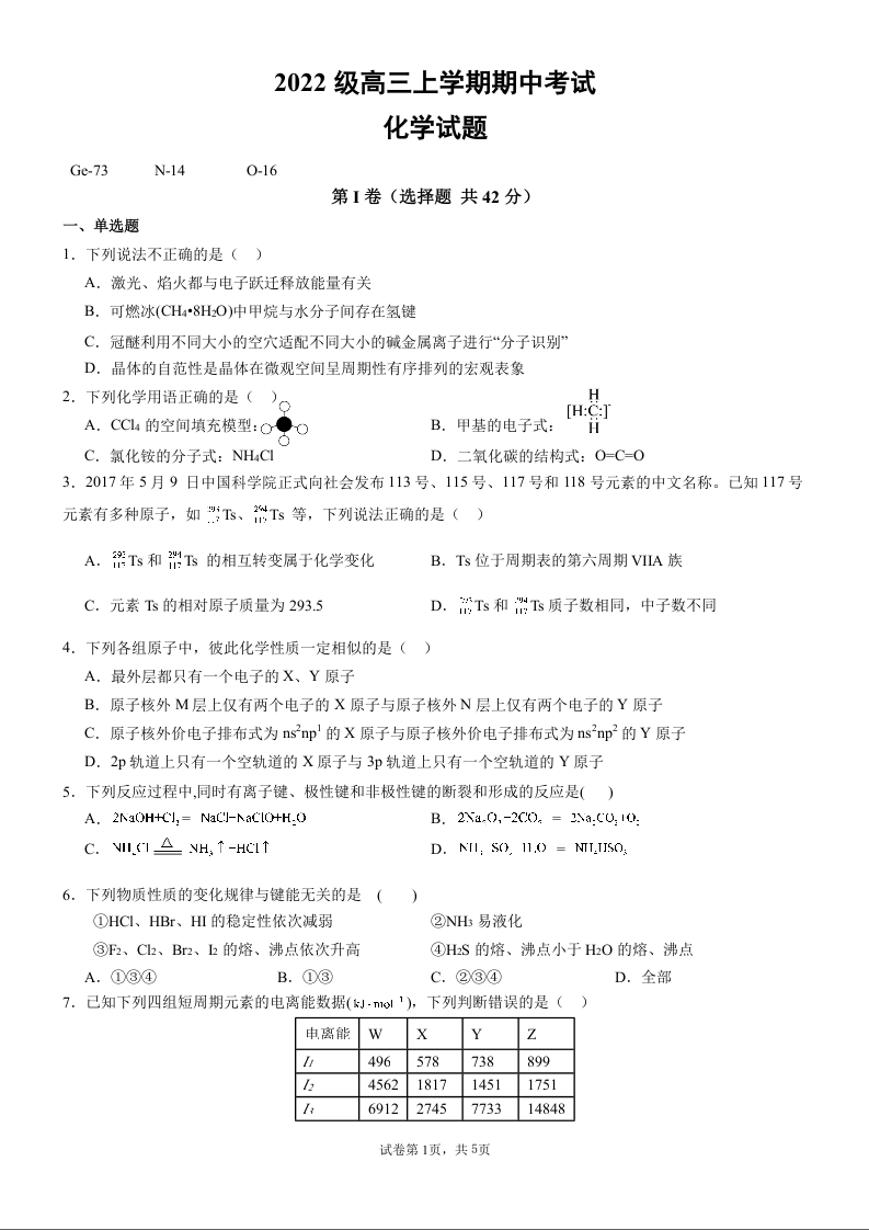 四川省仁寿第一中学校南校区2022级高三上学期期中考试化学