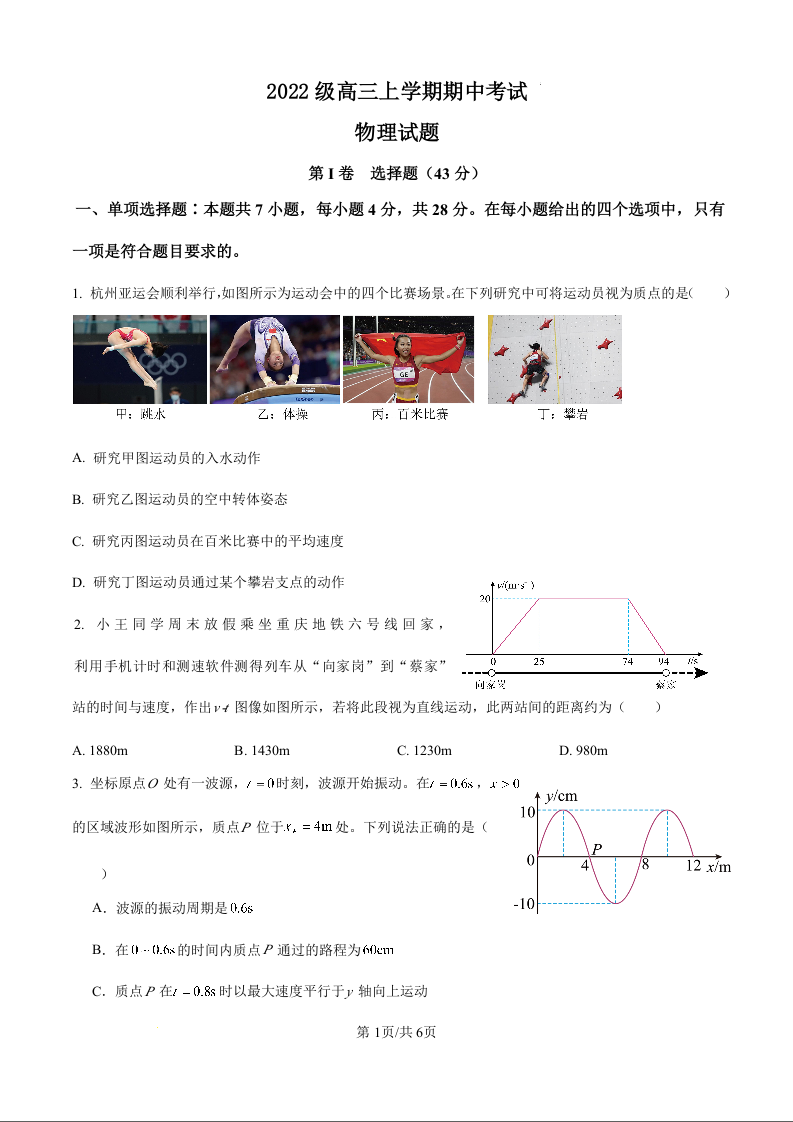 四川省仁寿第一中学校南校区2022级高三上学期期中考试物理