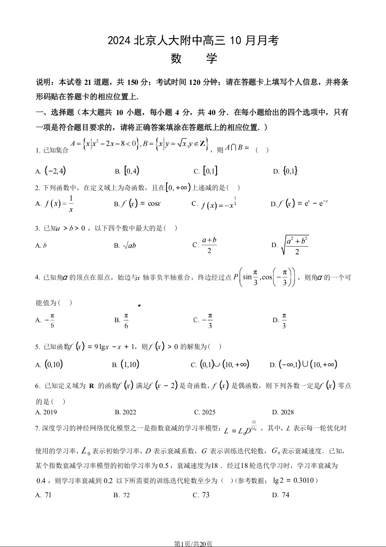 北京市中国人民大学附属中学2025届高三年级10月质量检测练习数学+答案