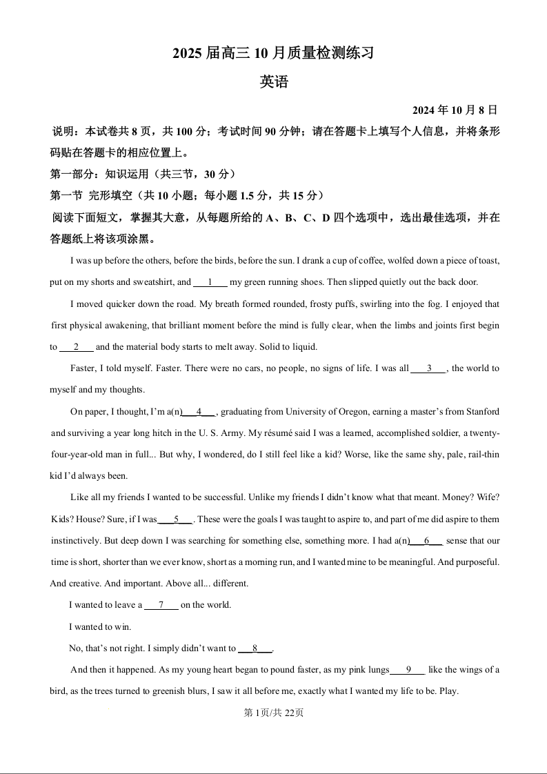 北京市中国人民大学附属中学2025届高三年级10月质量检测练习英语(精品解析版)