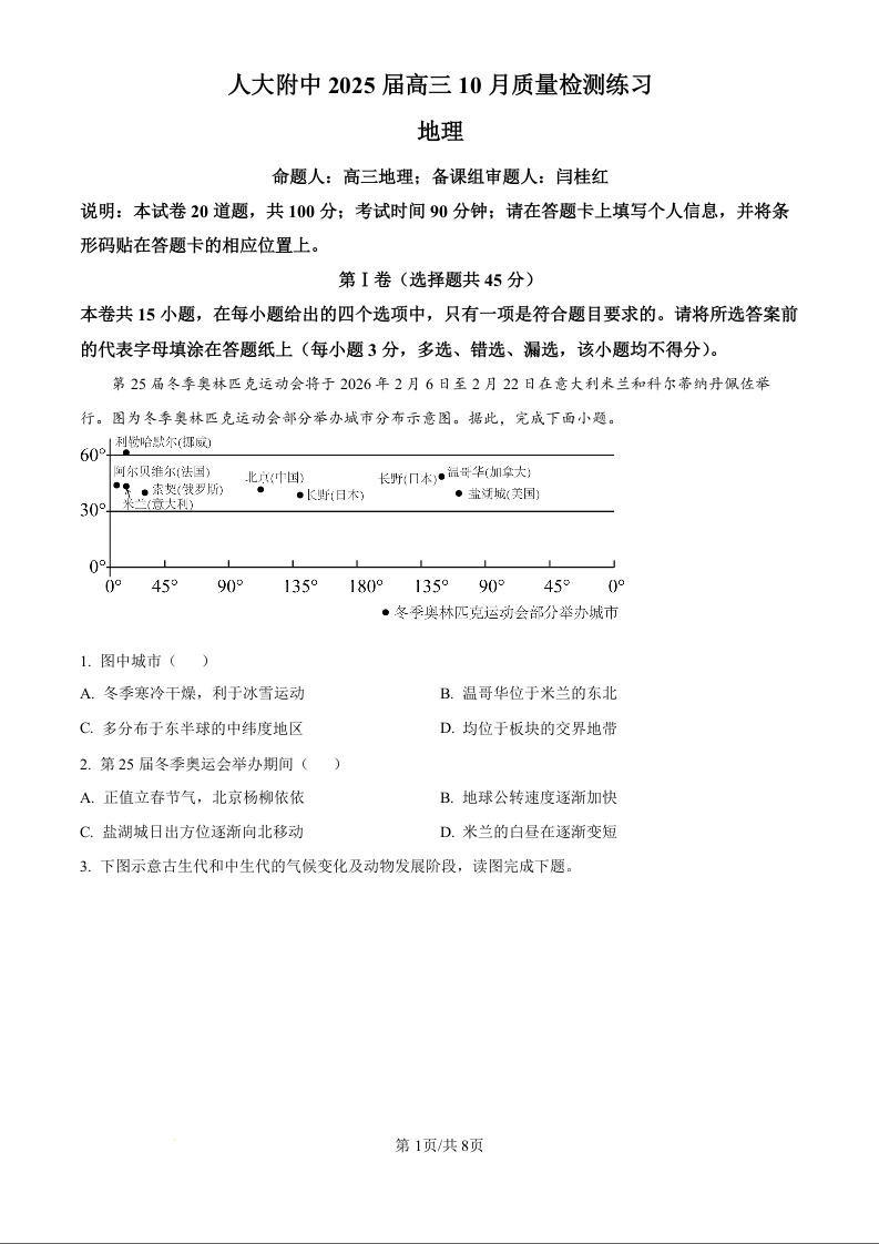 北京市中国人民大学附属中学2025届高三年级10月质量检测练习地理(原卷版)