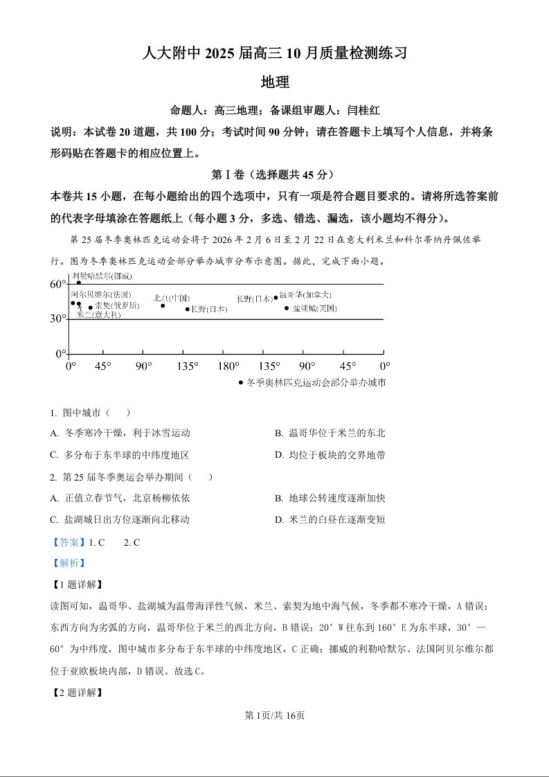 北京市中国人民大学附属中学2025届高三年级10月质量检测练习地理(精品解析版)