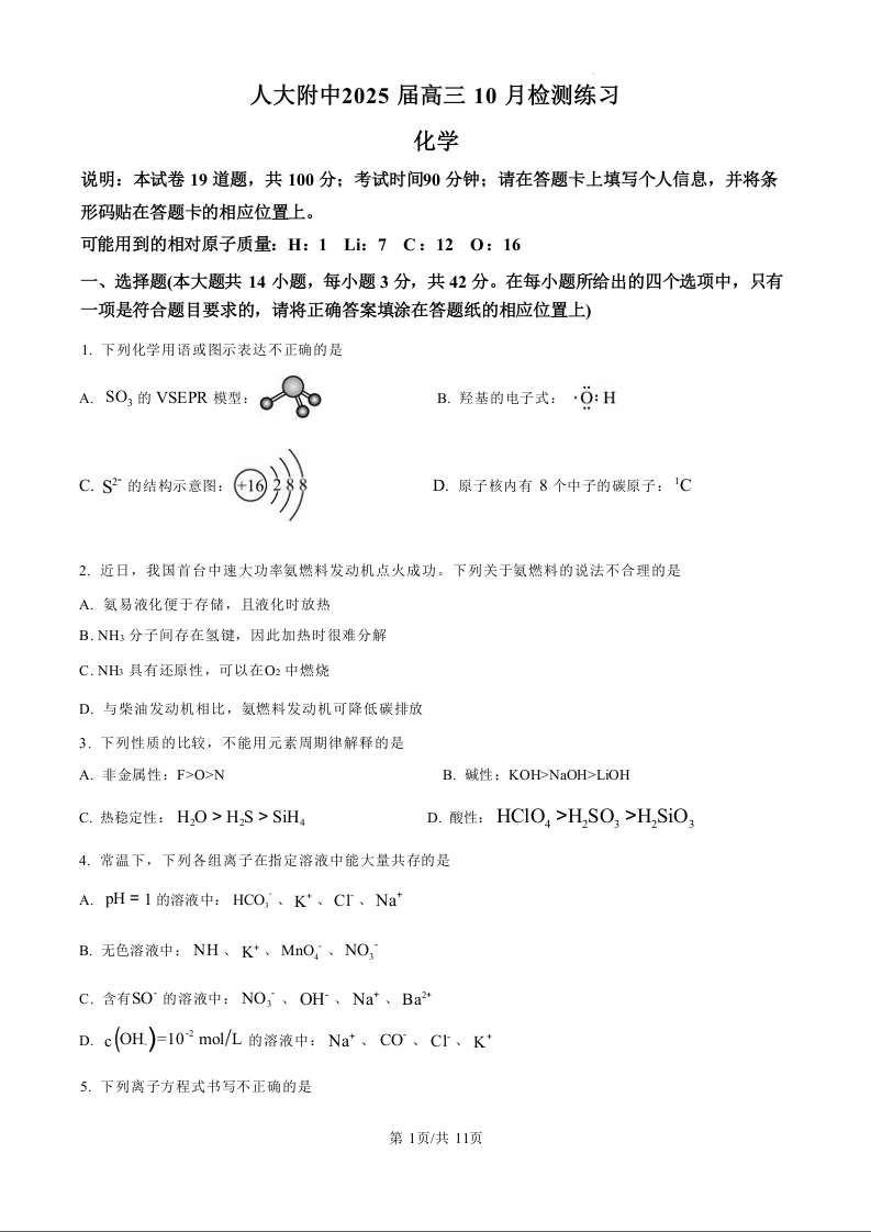 北京市中国人民大学附属中学2025届高三年级10月质量检测练习化学(原卷版)