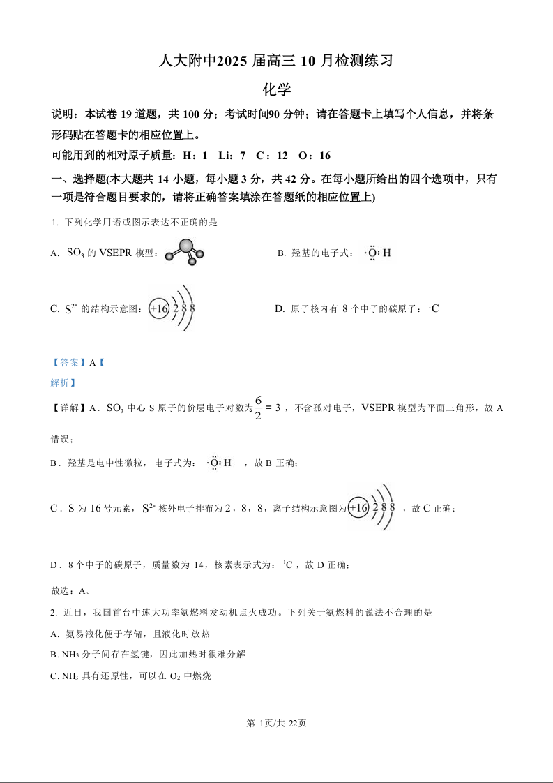 北京市中国人民大学附属中学2025届高三年级10月质量检测练习化学(精品解析版)