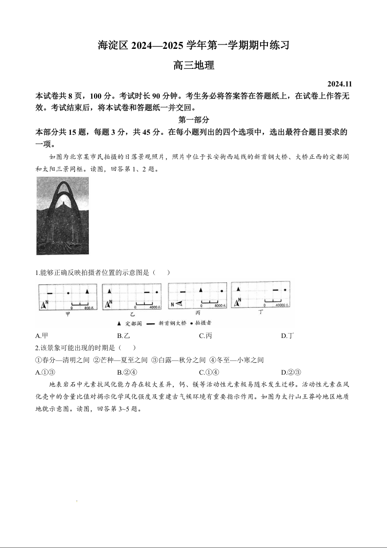 北京市海淀区2025届高三上学期期中考试地理