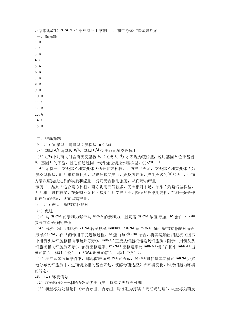 北京市海淀区2025届高三上学期期中考试生物答案
