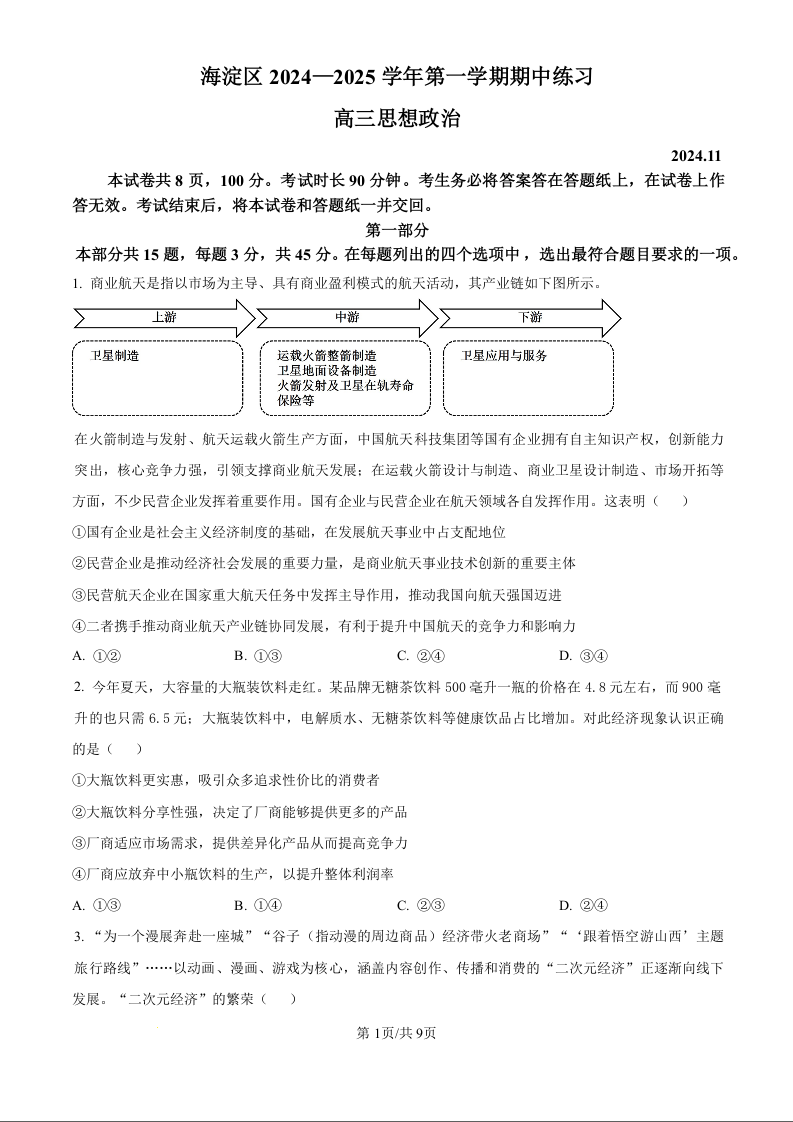北京市海淀区2025届高三上学期期中考试政治(原卷版)