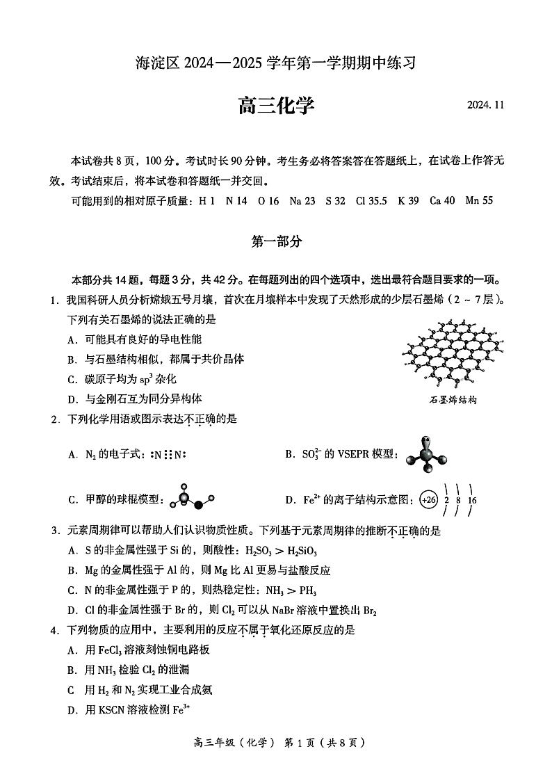 北京市海淀区2025届高三上学期期中考试化学+答案