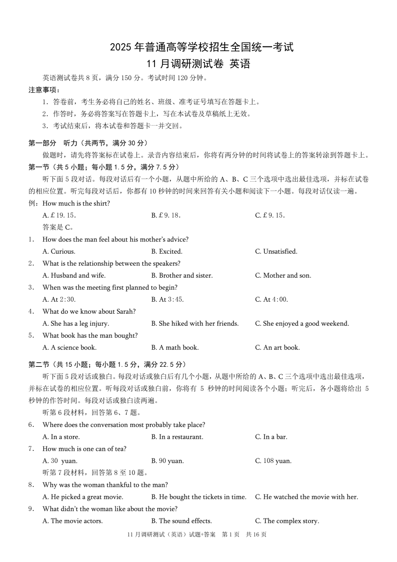 2025年重庆市普通高中学业水平选择性考试11月调研测试卷英语