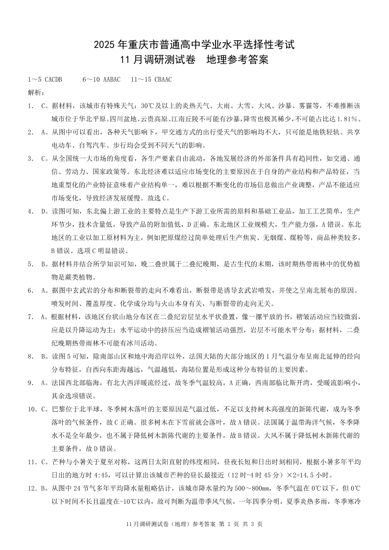 2025年重庆市普通高中学业水平选择性考试11月调研测试卷地理答案