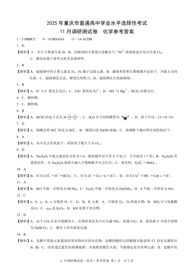 2025年重庆市普通高中学业水平选择性考试11月调研测试卷化学答案