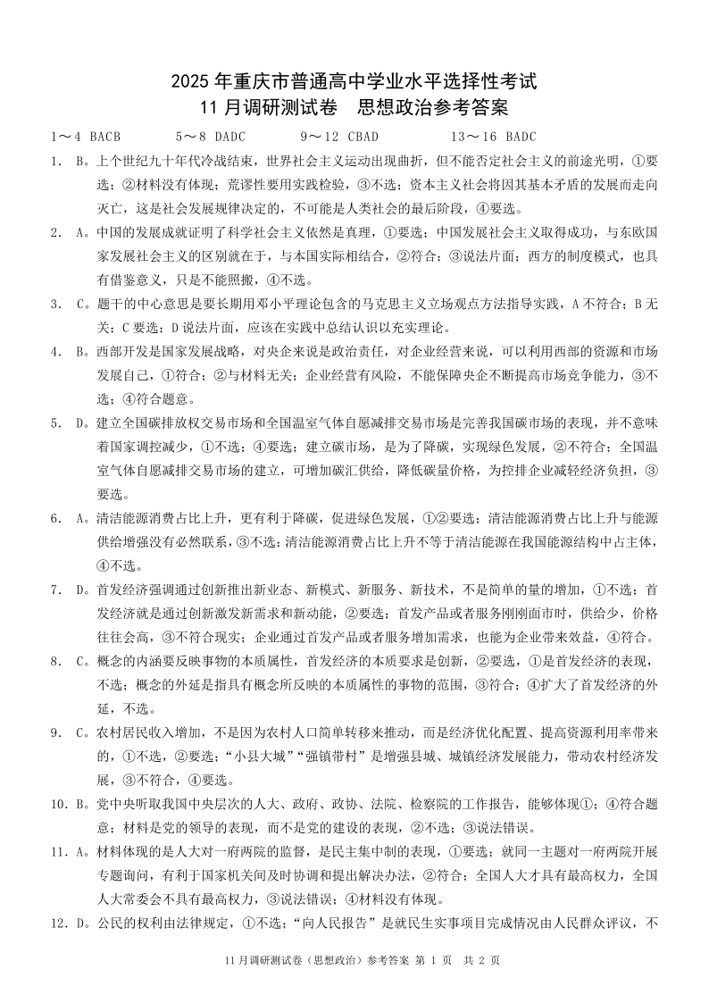 2025年重庆市普通高中学业水平选择性考试11月调研测试卷政治答案