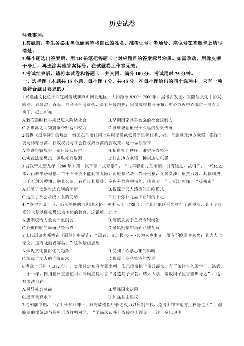 重庆巴蜀中学月考2025届高三适应性月考卷(三)历史
