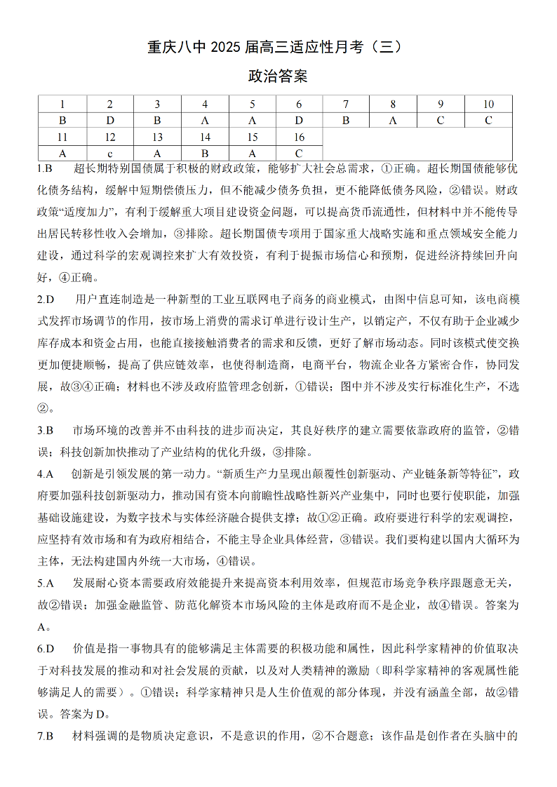 重庆市第八中学2025届高考适应性月考卷(三)政治答案