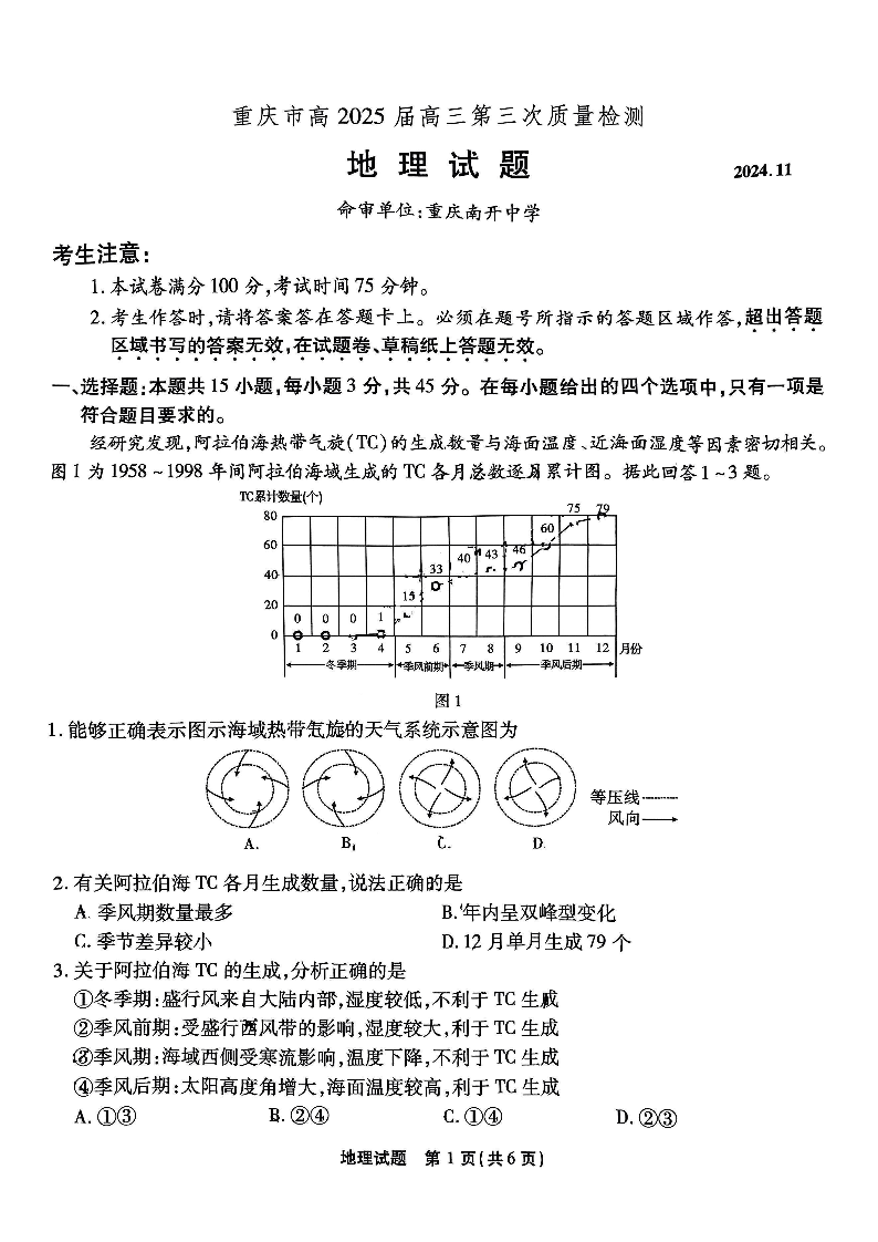 重庆市南开中学高2025届高三第三次质量检地理