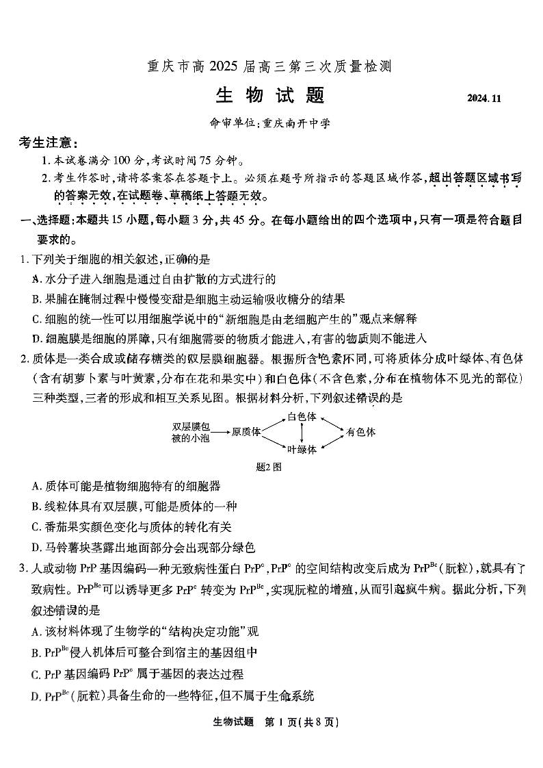 重庆市南开中学高2025届高三第三次质量检生物