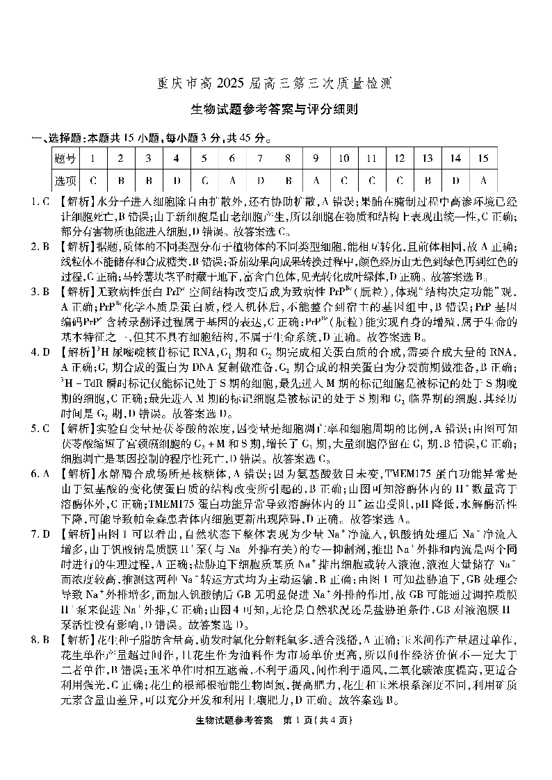 重庆市南开中学高2025届高三第三次质量检生物答案