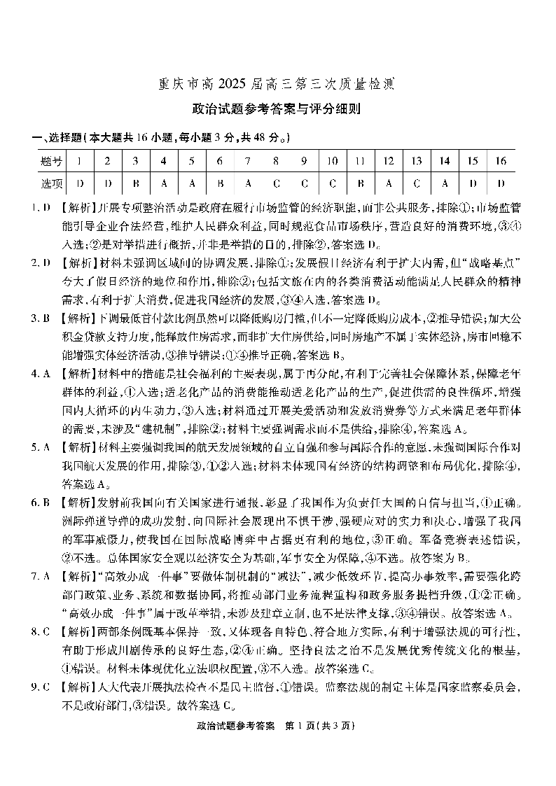 重庆市南开中学高2025届高三第三次质量检政治答案