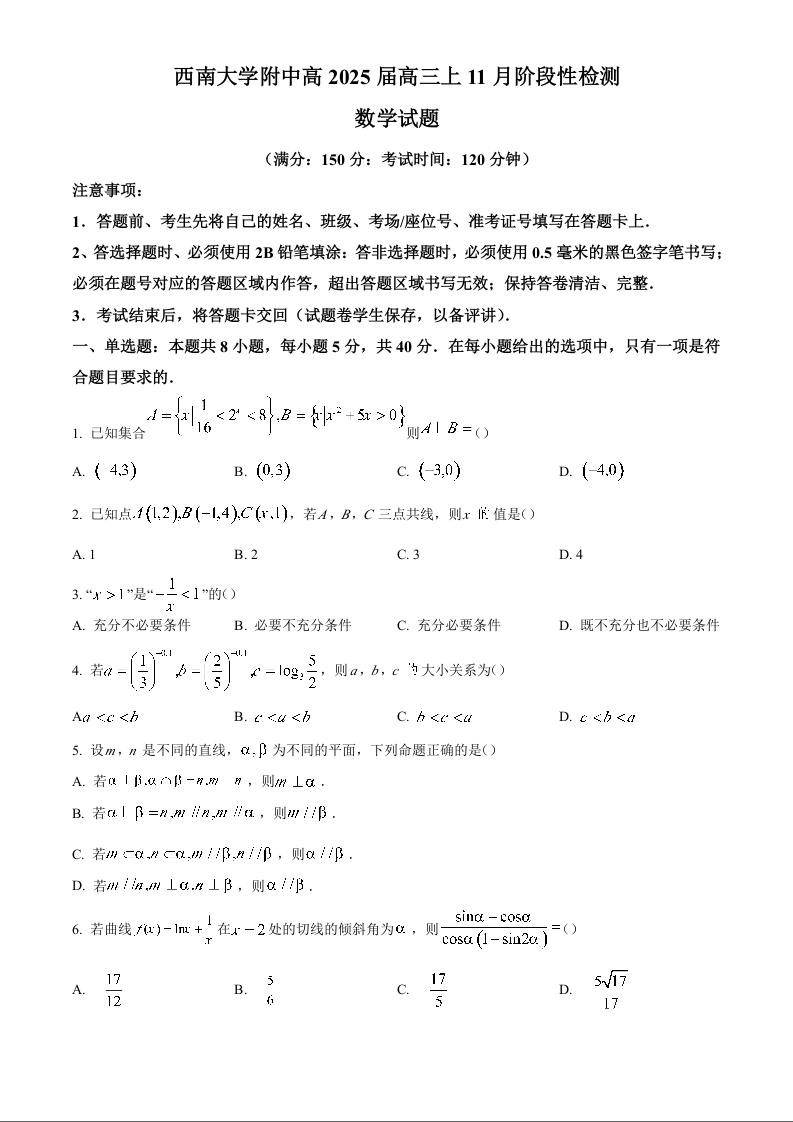 重庆市西南大学附属中学2025届高三上学期11月阶段性检测数学