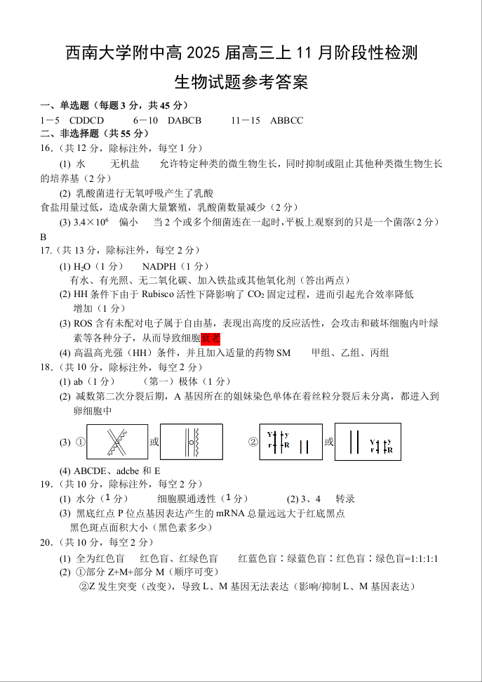 重庆市西南大学附属中学2025届高三上学期11月阶段性检测生物答案