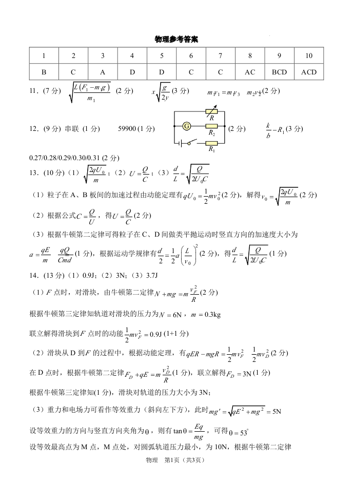 重庆市西南大学附属中学2025届高三上学期11月阶段性检测物理答案