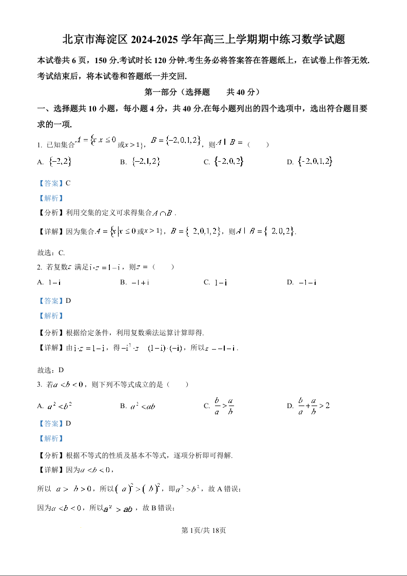 北京市海淀区2025届高三上学期期中考试数学(精品解析版)
