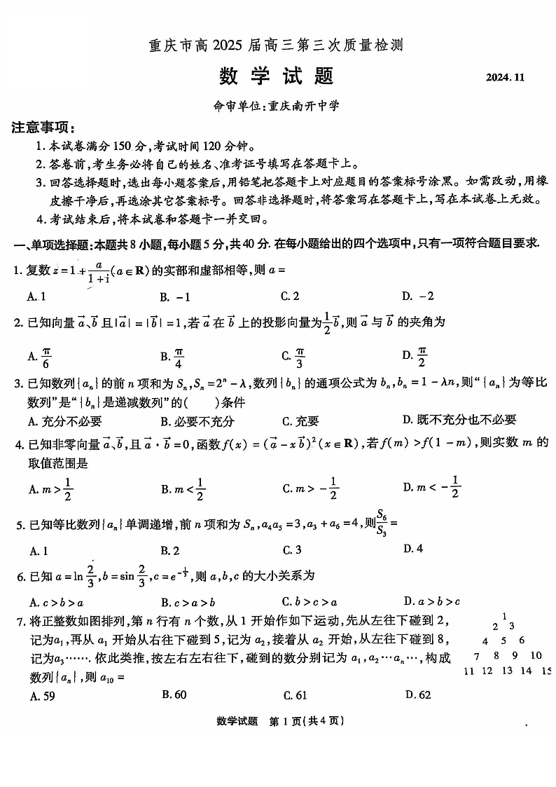 重庆市南开中学高2025届高三第三次质量检数学