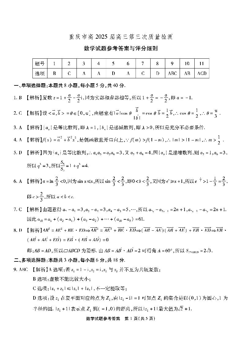 重庆市南开中学高2025届高三第三次质量检数学答案