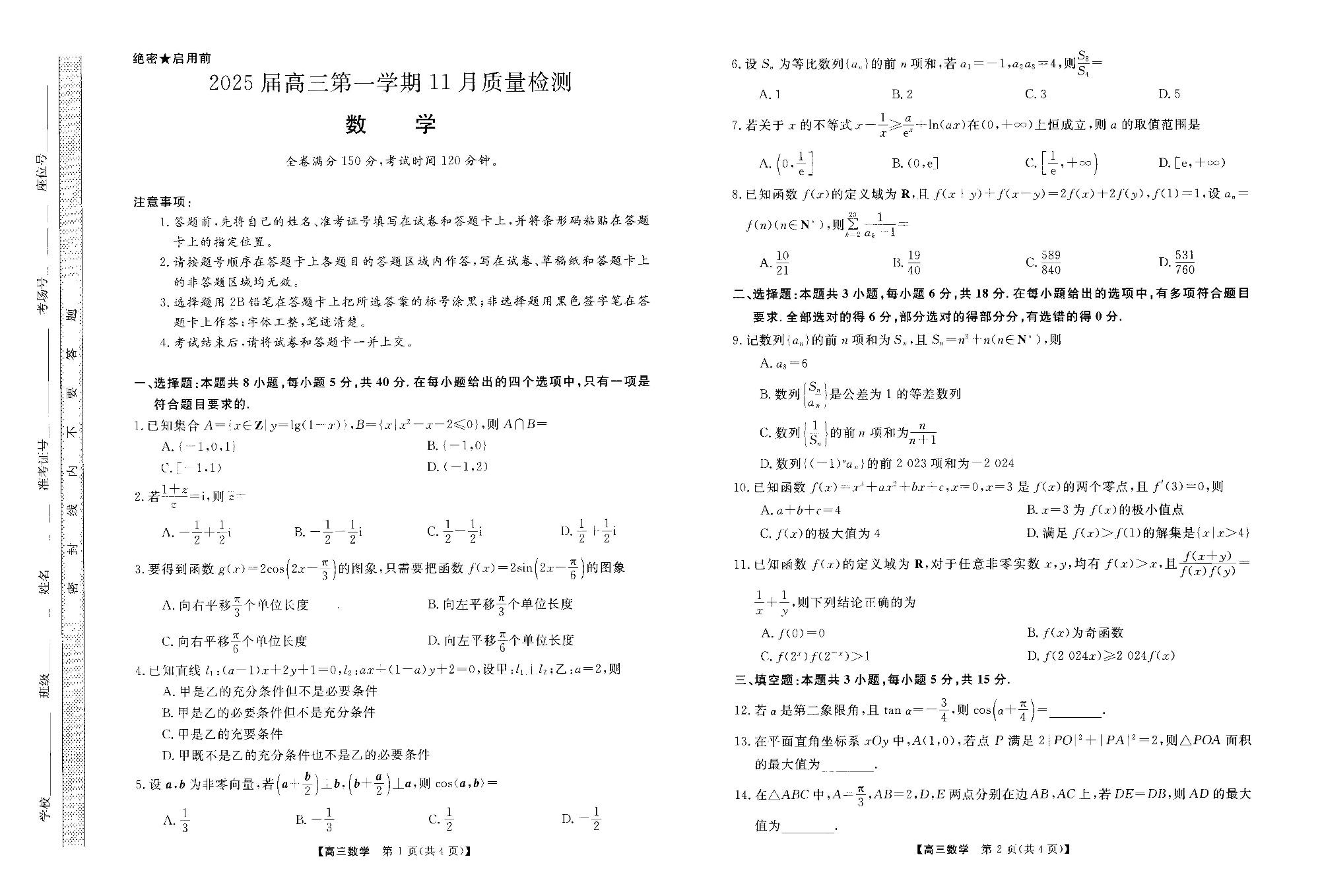 河南省华师联盟2025届高三第一学期11月质量检测 数学及答案