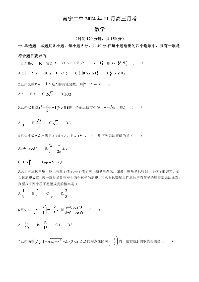 【广西卷】广西南宁市第二中学2025届高三上学期11月月考数学