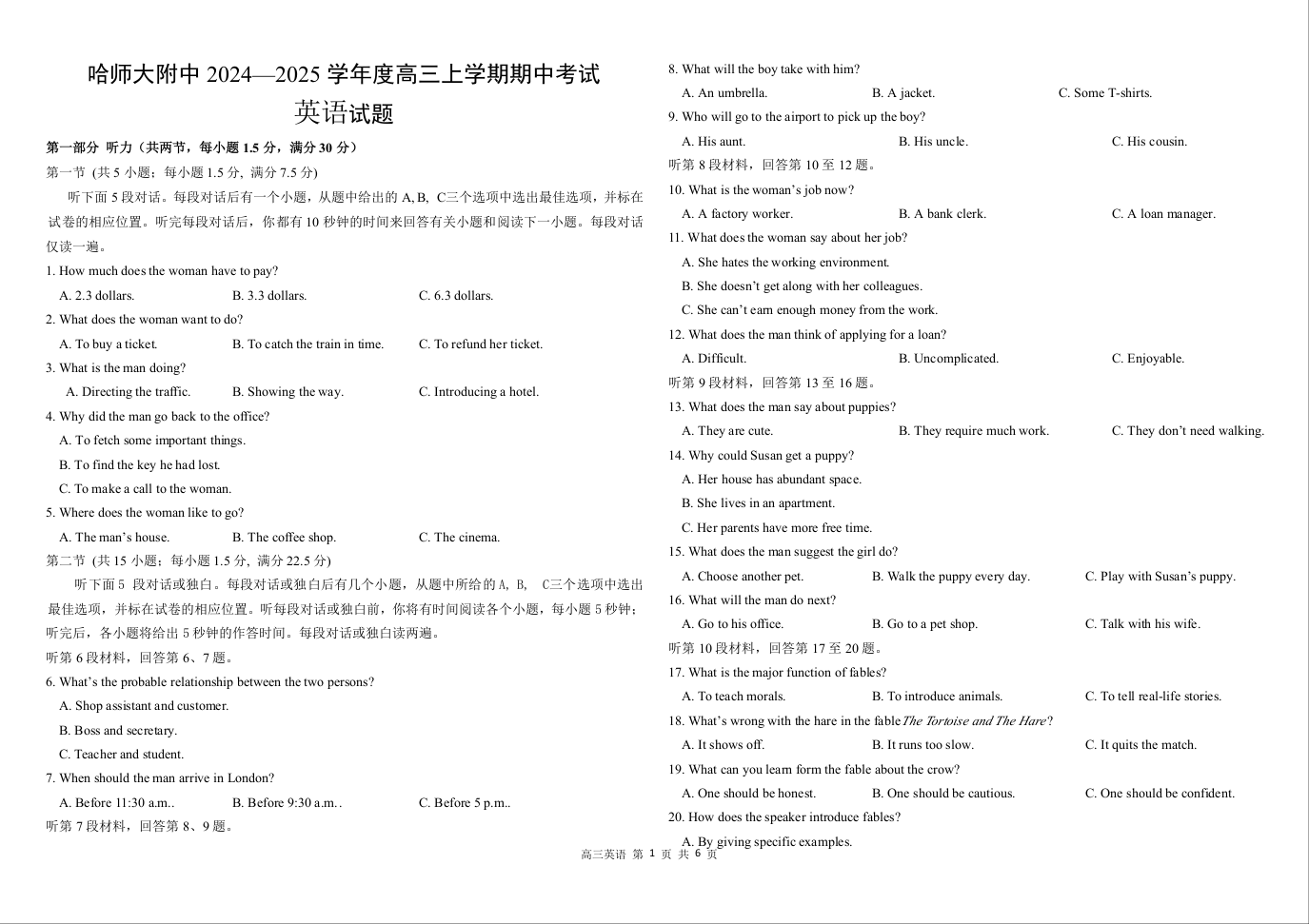 黑龙江省哈尔滨师范大学附属中学2025届高三上学期期中考试英语