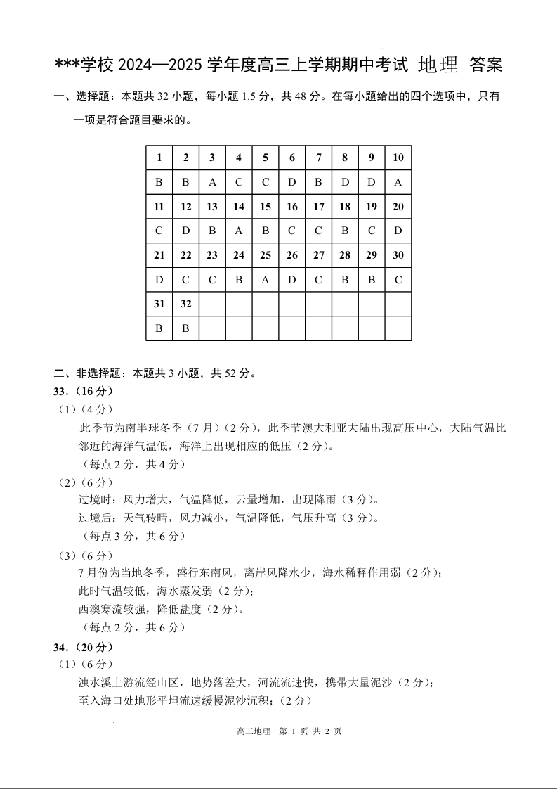黑龙江省哈尔滨师范大学附属中学2025届高三上学期期中考试地理答案
