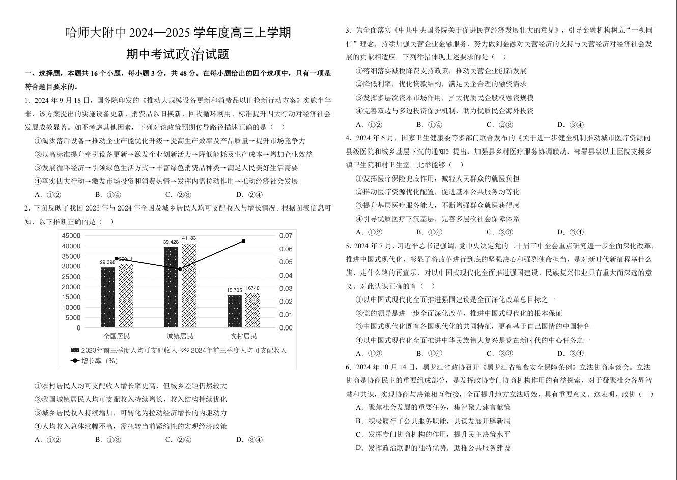 黑龙江省哈尔滨师范大学附属中学2025届高三上学期期中考试政治