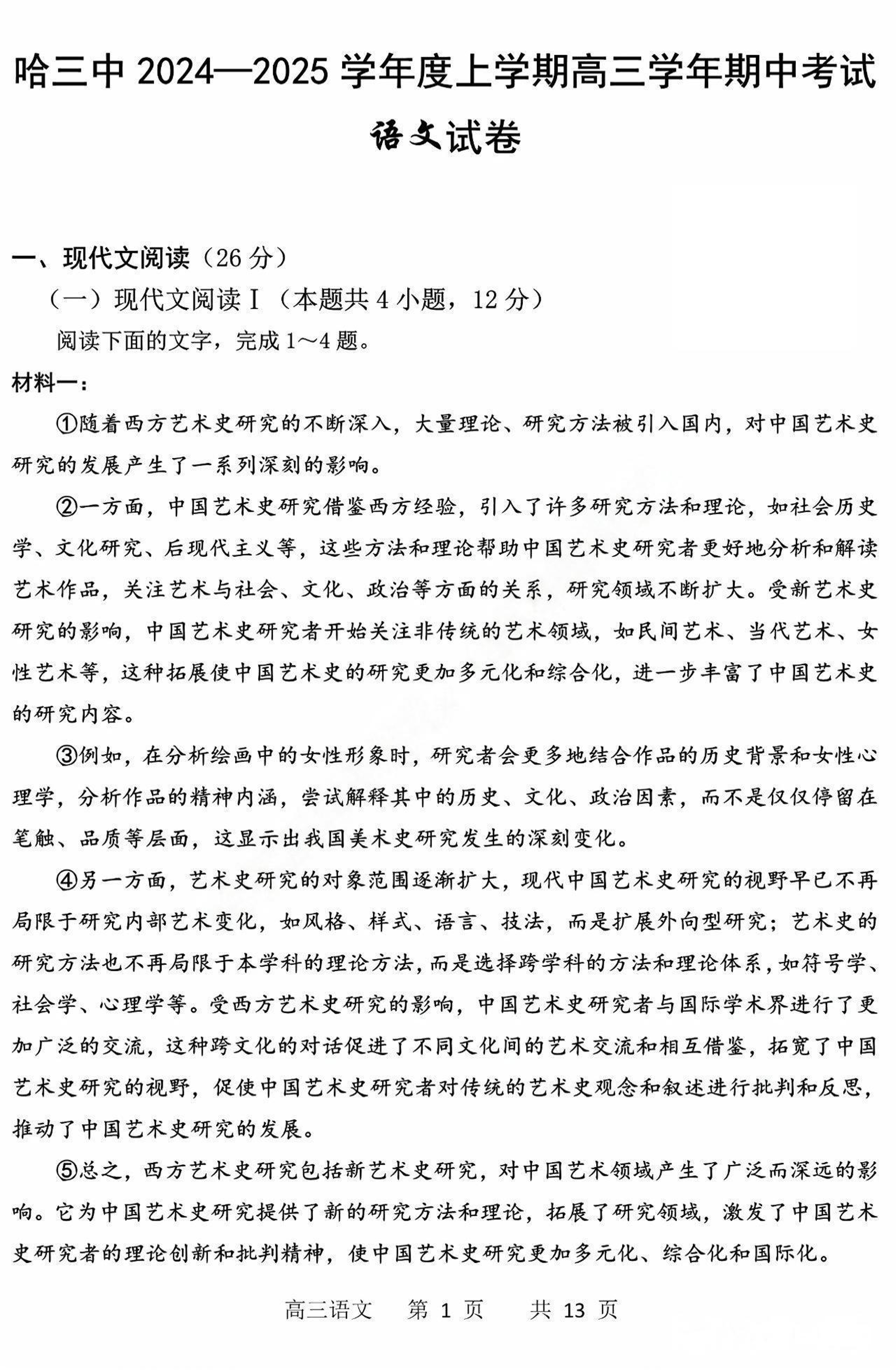 黑龙江省哈尔滨市第三中学2025届高三上学期期中考试语文+答案