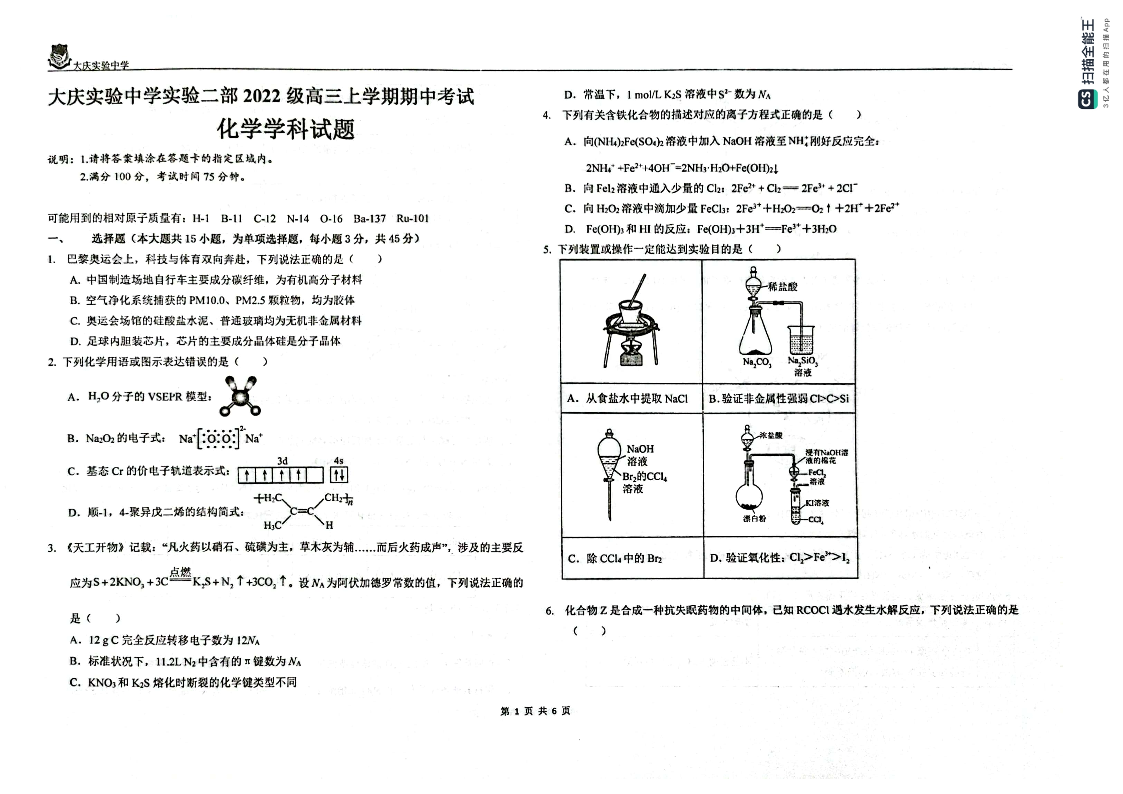 黑龙江省大庆市实验中学实验二部2025届高三上学期期中考试化学