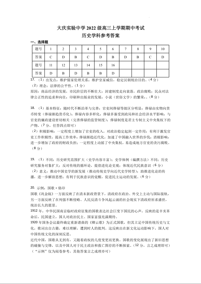 黑龙江省大庆市实验中学实验二部2025届高三上学期期中考试历史答案