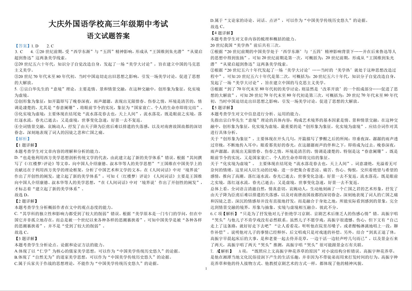 黑龙江省大庆外国语学校2025届高三上学期期中考试语文答案