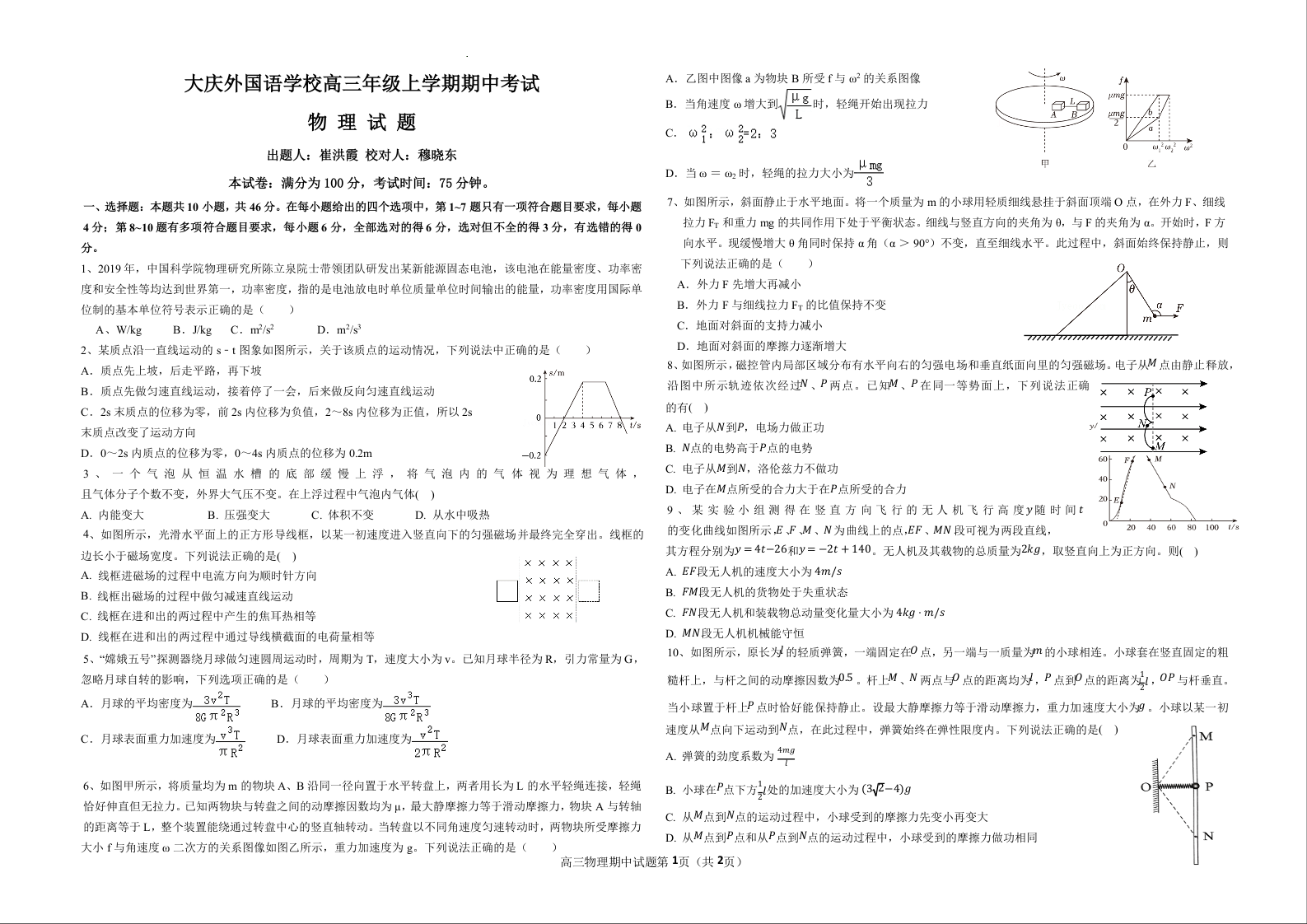黑龙江省大庆外国语学校2025届高三上学期期中考试物理