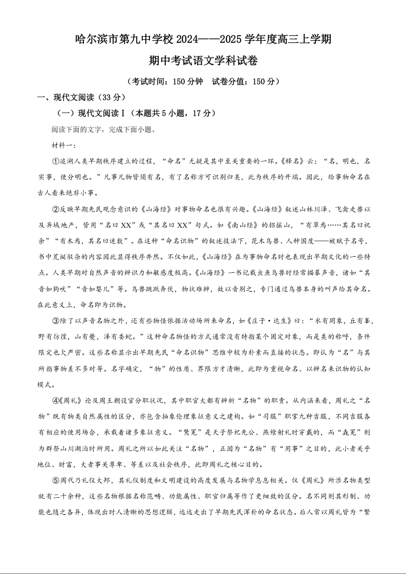 黑龙江省哈尔滨市第九中学2025届高三上学期期中考试语文+答案